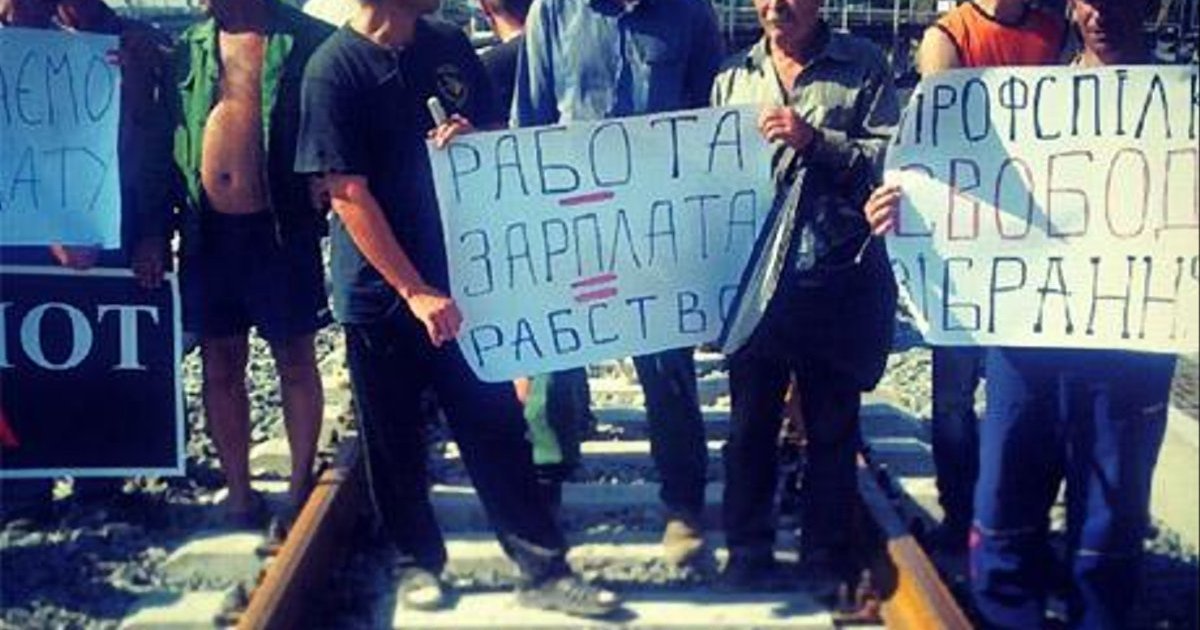 В руках железнодорожники держат плакаты с лозунгами "Требуем зарплату", "Работа - зарплата = рабство" и другие.