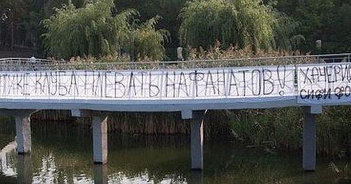 На набережной в Донецке неизвестные вывесили огромный транспарант со словами: "Политике клуба плевать на фанатов! Хачериди, сиди дома".