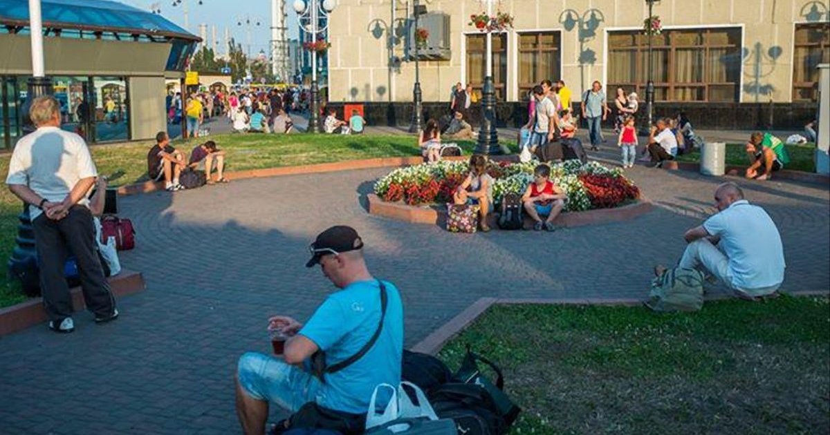 Киев-Пассажирский встречает гостей столицы и путешественников "современными удобными залами ожидания" на свежем воздухе.