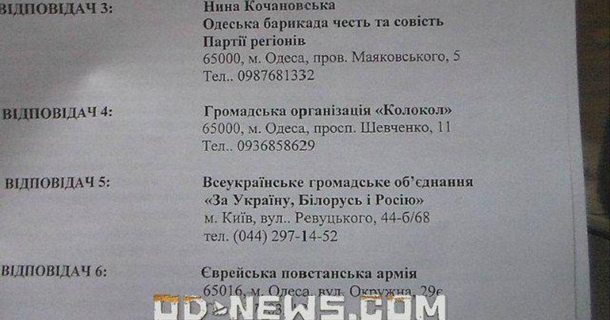 Среди тех, кто подал уведомления об акциях, направленных на противодействие ВО «Батьківщина» и ВО «Свобода» в частности, «Еврейская повстанческая армия», «Одесский областной Союз рабочих», организация «Колокол», зарегистрированная почему-то по адресу одесской организации «Национального союза журналистов» (пр. Шевченко, 11) и прочие несуществующие и маргинальные движения.