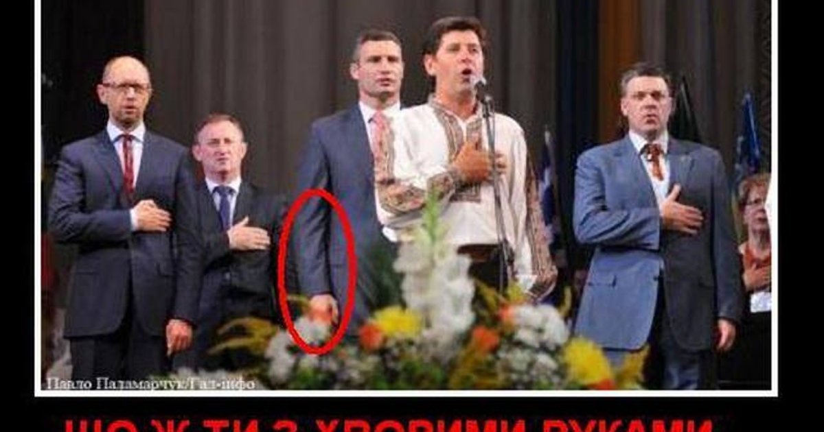 Сегодня депутат-«свободовец» Игорь Мирошниченко опубликовал на своей странице в социальной сети карикатуру на Кличко, где политик-боксер запечатлен на Всемирном конгрессе украинцев во Львове. В отличие от других оппозиционеров, Кличко единственный, кто во время исполнения гимна Украины не приложил руку к сердцу, передает Цензор.НЕТ со ссылкой на НР2.
