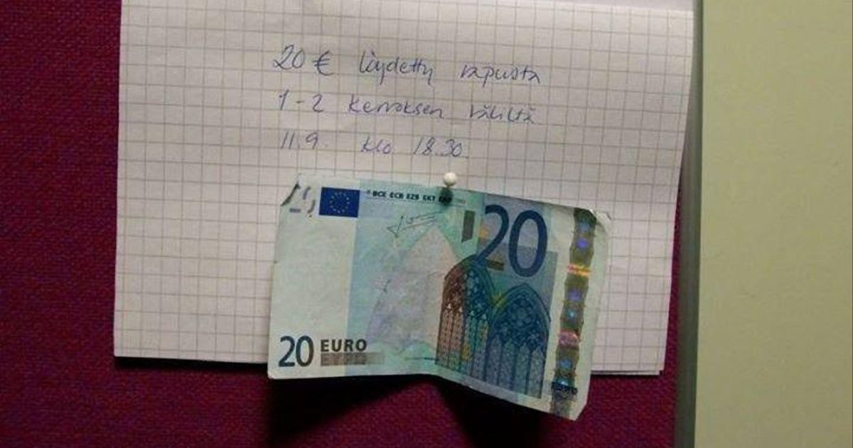 "20 евро найдено в подъезде между вторым и первым этажом 11 сентября в 18:30" (обычный финский подъезд в районе Тёёлё, Хельсинки).