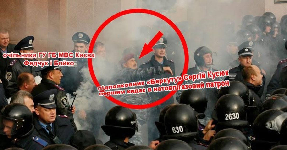 Так, активист организации "Спільна справа" Сергей Тищенко опубликовал фото, на котором четко видно, что подполковник "Беркута" Сергей Кусюк кидает в толпу газовый патрон.