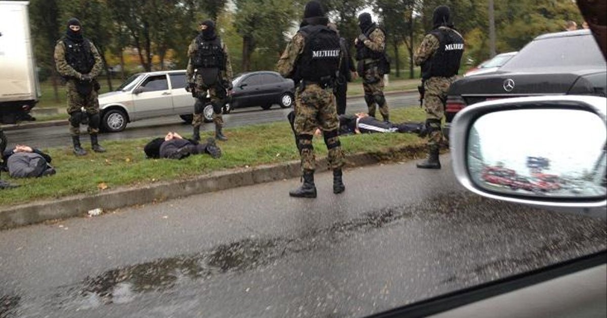 Возле машин лежали трое подозреваемых лицом вниз с наручниками на запястьях. По предварительной информации, задержанные подозреваются в похищении людей и взятии заложников.