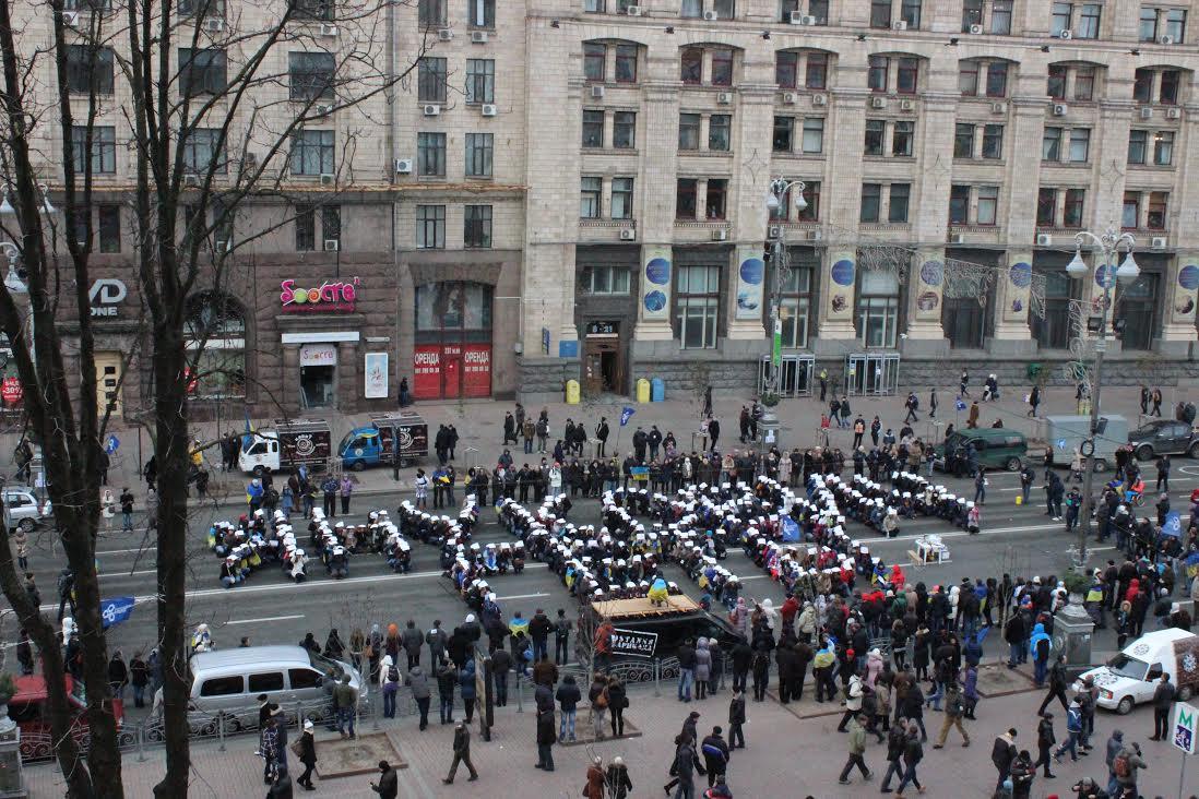 Флеш-моб "Отправь Януковича в отставку!" провели на Крещатике. Почти 500 человек воссоздали надпись из 12 букв на всю ширину дороги "Янукович Геть!".