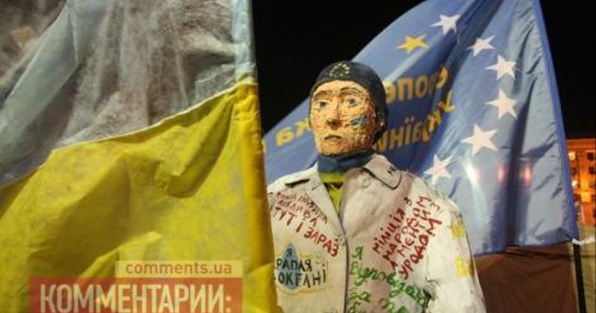 В Киеве на Майдане Независимости столичные скульпторы из гипса соорудили фигуру неизвестному революционеру. Скульптуру облачили в шапку с символикой ЕС, а также всего расписали евроинтеграционными лозунгами.