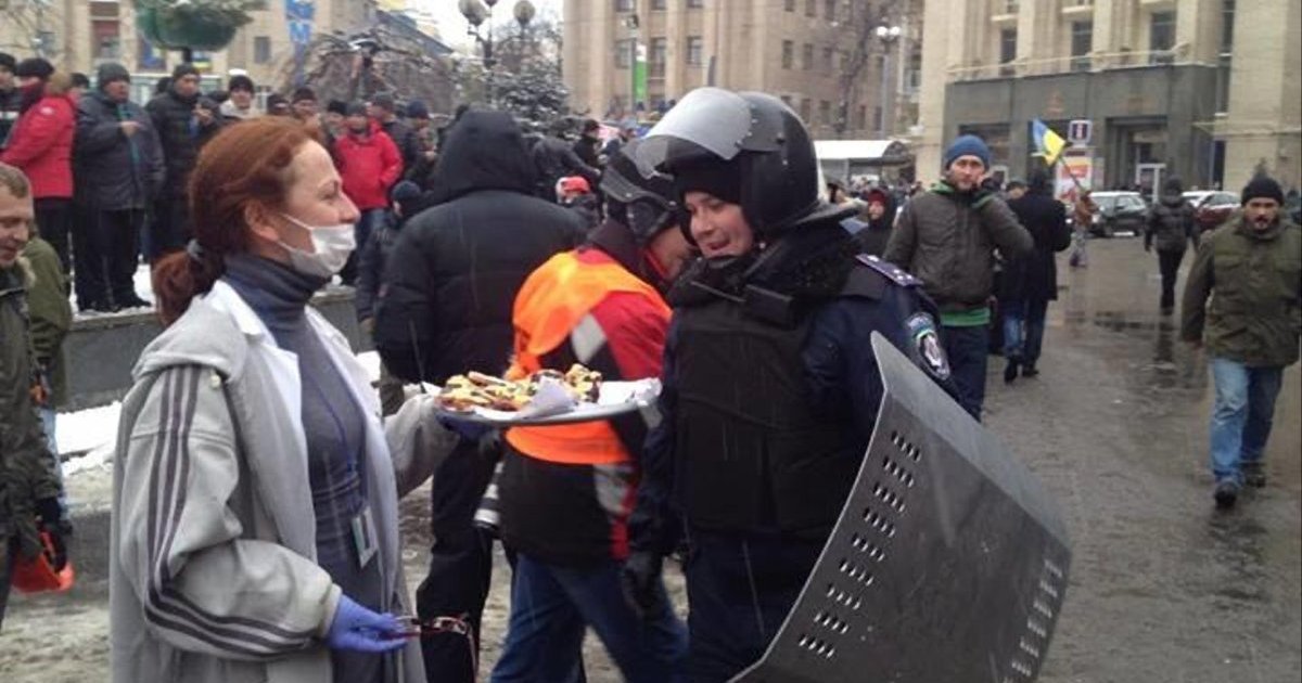 Активистки на Евромайдане предлагают вооруженным силовикам угощения
