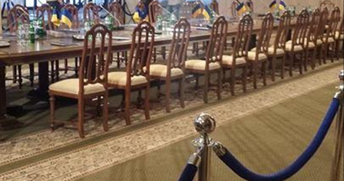 "Общенациональный" круглый стол, который должен был начаться в 14:00. Стол выставлено в коридоре дворца Украина. Из присутствующих - коммунист Симоненко и Кулиняк, который теперь вроде как директор дворца. //а охрана этого всего такая, что прям ах!", - подписала фото журналист.