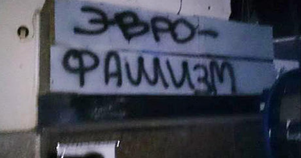 По его словам, фасады штаба, нескольких близлежащих домов и магазинов разрисованы клеветническими надписями в адрес сторонников евроинтеграционного направления Украины: "Еврофашизм", "Евронацисты" и т.п..