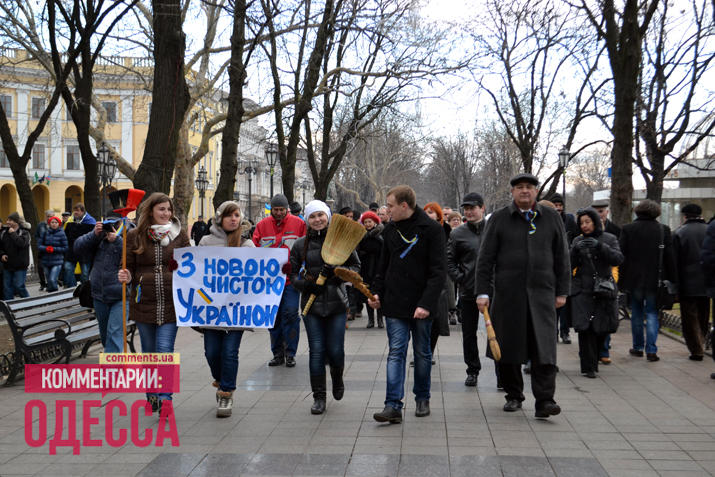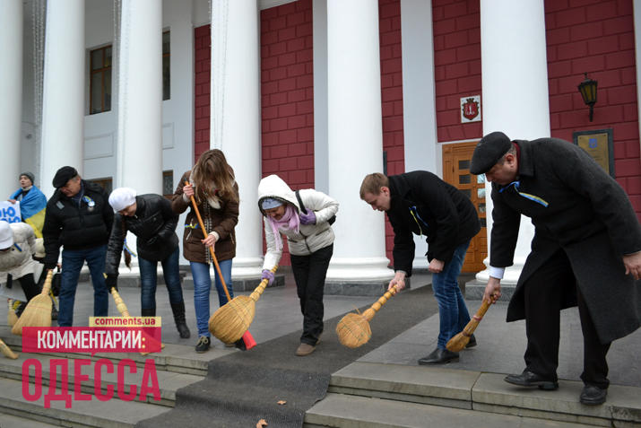 После двухчасового выступления активисты Евромайдана подошли к зданию Одесского городского совета и символически «вымели» недобросовестных чиновников.