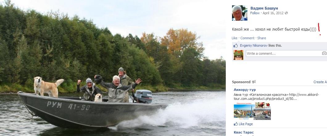 Стоит отметить еще одно место, где побывал депутат Вадим Башун. Это Камчатка. Если 2013 году он отдыхал и рыбачил вместе с регионалами из облсовета, то в 2012 изложил в соцсеть фото, где видно, что на Камчатку он взял с собой друга- дерибанщика - депутата Ирпенского совета Валерия Пешого.