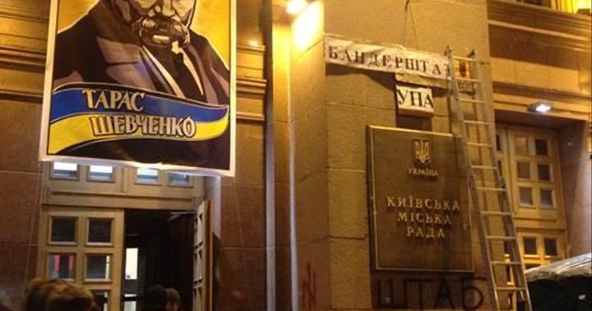 Скандальный банер с вождем украинских националистов Степаном Бандерой на здании КГГА заменили изображением Тараса Шевченко.