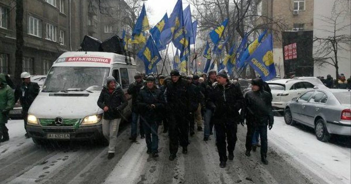 Люди несут национальные флаги, а также партийные флаги «Свободы». Участники акции скандируют «Ганьба!», «Они крадут людей!».