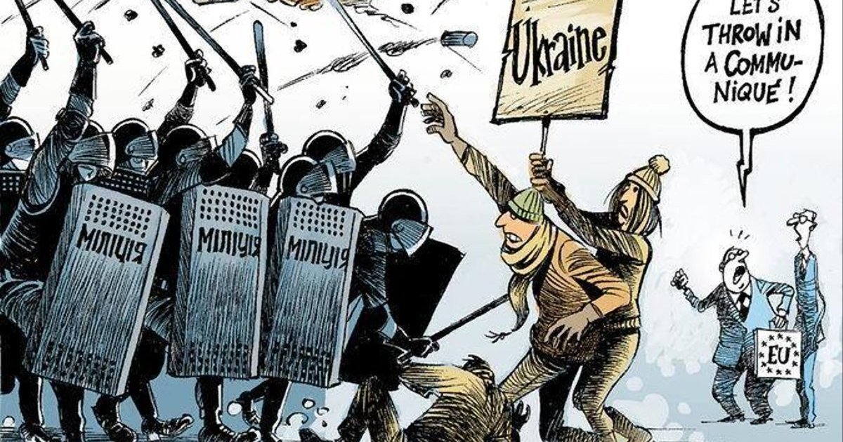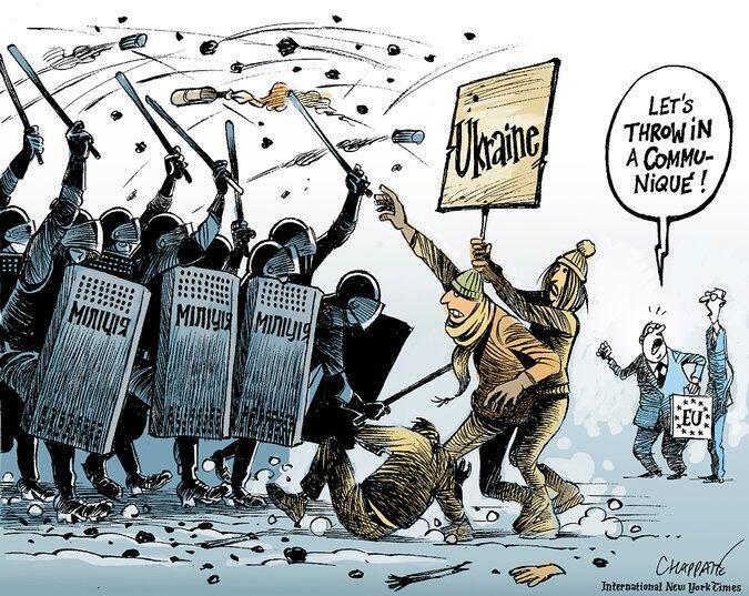 "Нью-Йорк Таймс" этой карикатурой упрекает Евросоюза за пассивность в украинском вопросе. Имел сегодня возможность услышать одного человека со стороны учреждений ЕС - такое впечатление, что они опаздывают с восприятием ситуации на пару недель и их оценки находятся на уровне где-то 7 января", - пишет журналист.