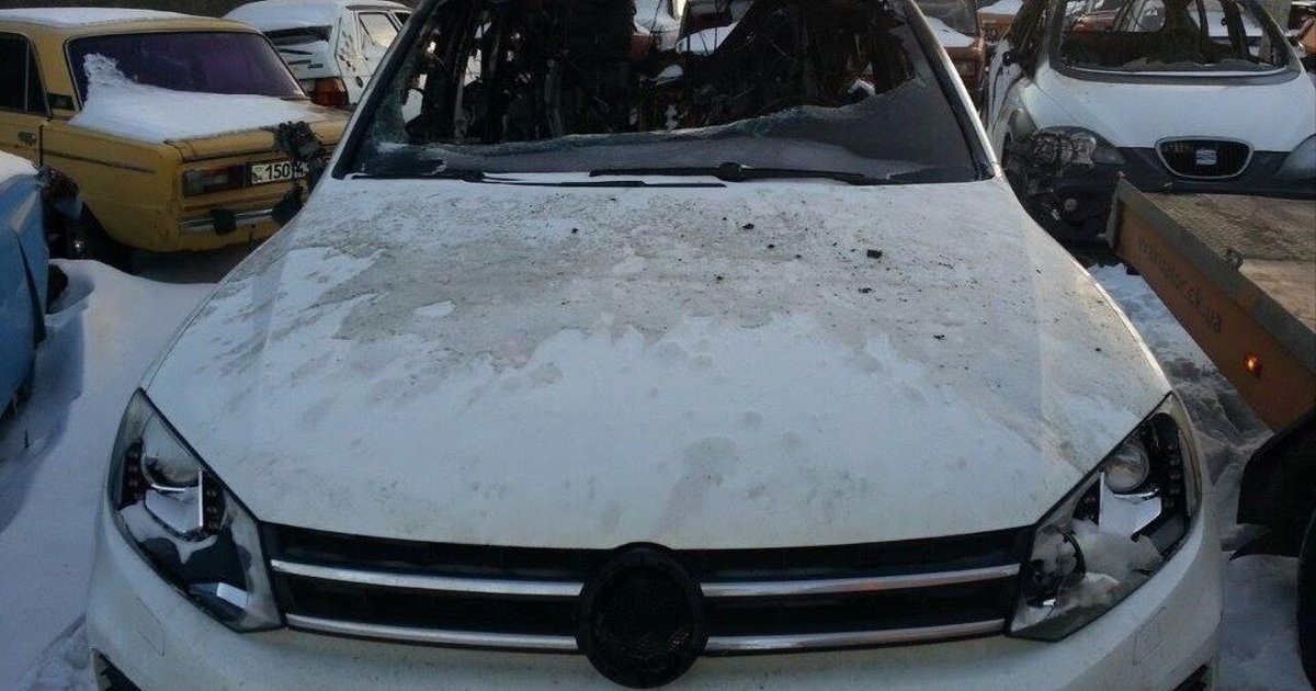 " Вот такой вид теперь имеет легендарный белый Туарег одного из лидеров Автомайдана Сергея Хаджинова. Он уже был для нас не просто автомобилем, не просто средством передвижения, он для нас стал уже членом нашей большой семьи, поэтому месть будет соответствующая...Кровная", - написал активист.