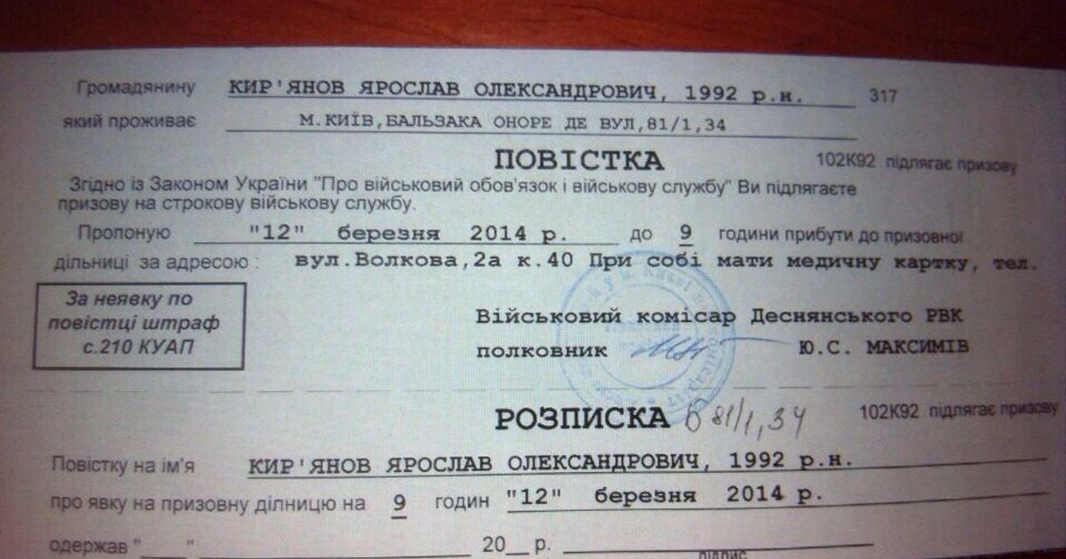«Если в Украине отменен военный призыв, то что ЭТО такое? Говорят, в пределах лишь этого ЖЭКа Деснянского района пришло около ста таких повесток», - отметил Арьев.