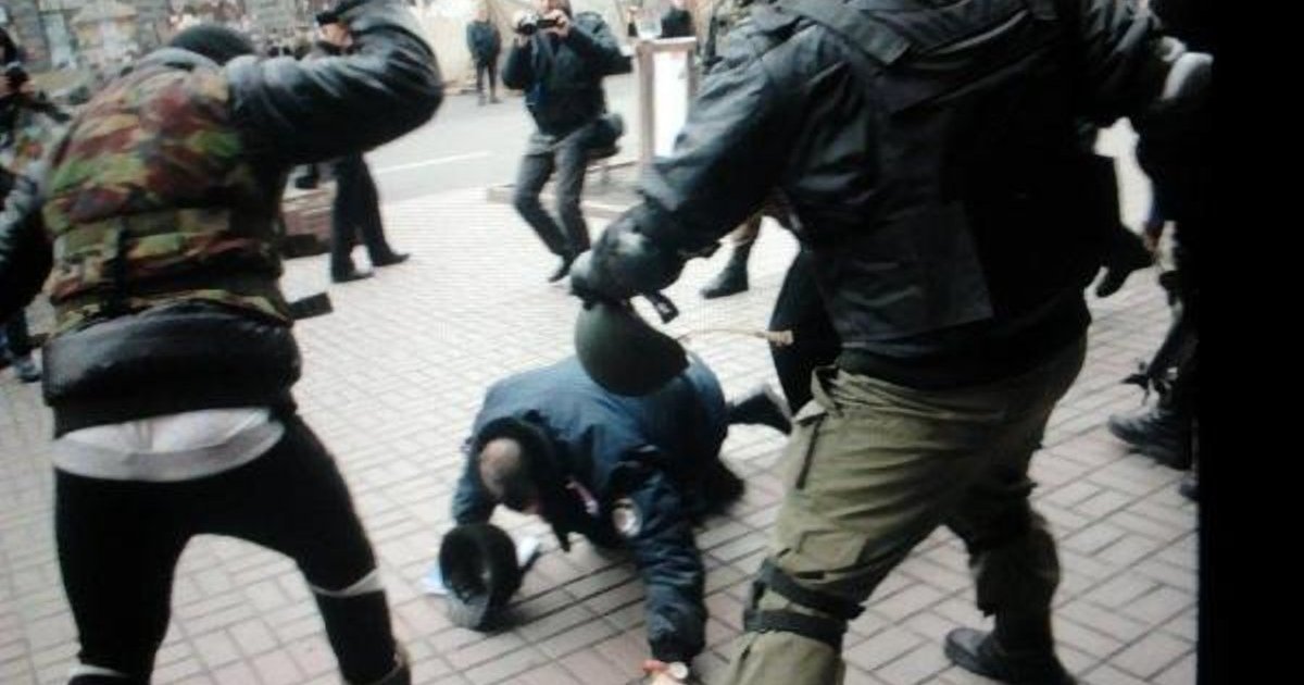 Силовики спускались с лестницы КГГА, когда протестующие начали от них требовать уйти с территории протеста. При этом неизвестные люди в масках начали потасовку с милиционерами.