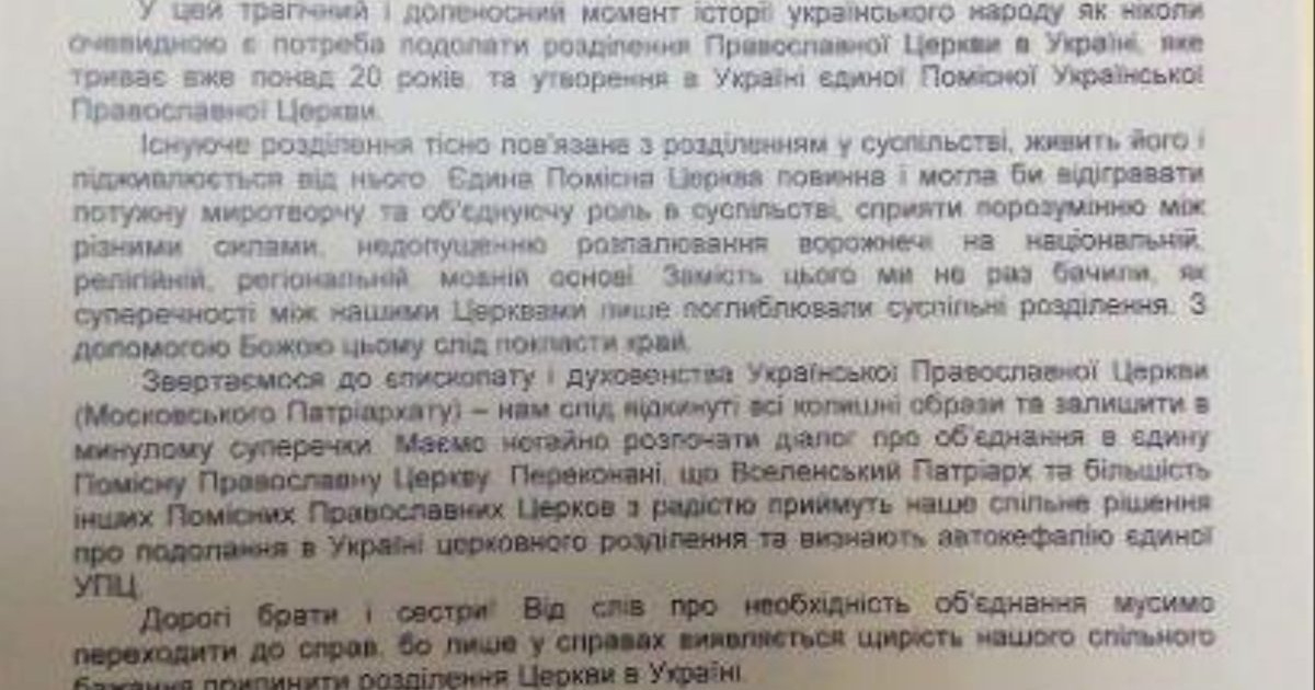 Киевский Патриархат призывает Московский преодолеть раскол. ДОКУМЕНТ