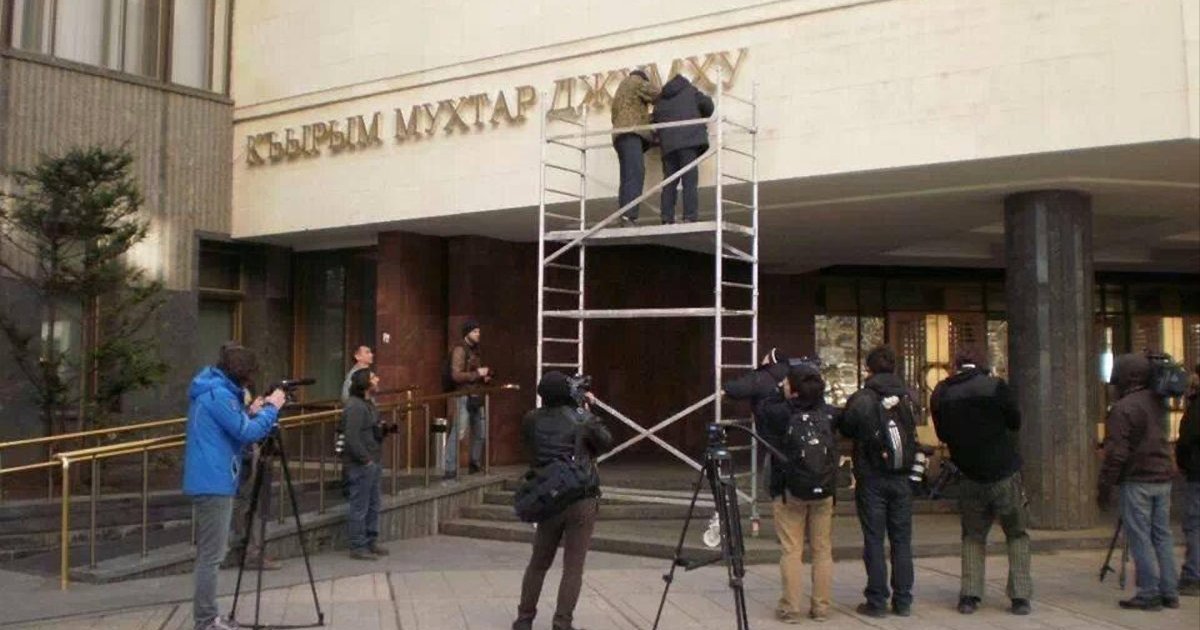 По приказу самопровозглашенного марионеточного правительства Крыма с фасада здания Верховной Рады республики убирают украинское и крымско-татарское название.