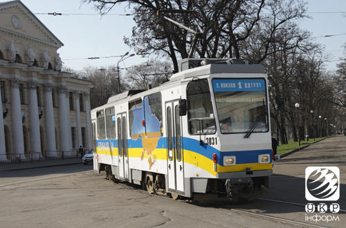 В Днепропетровске по центральным улицам по первому маршруту курсирует патриотический трамвай.