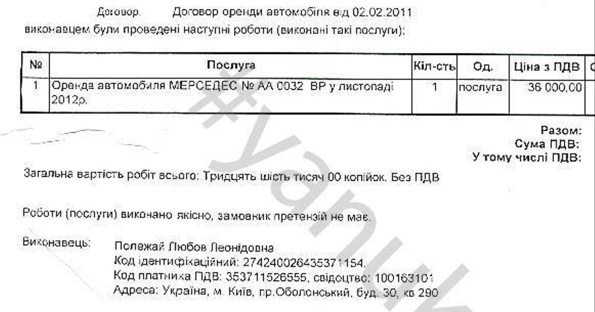 Из данного документа следует, что Полежай Л.Л.(исполнитель), произвела работу (услугу) и получила оплату от КИЕВУНИВЕРСАЛСЕРВИС, заказчика работы (услуги) - 36000 грн.
