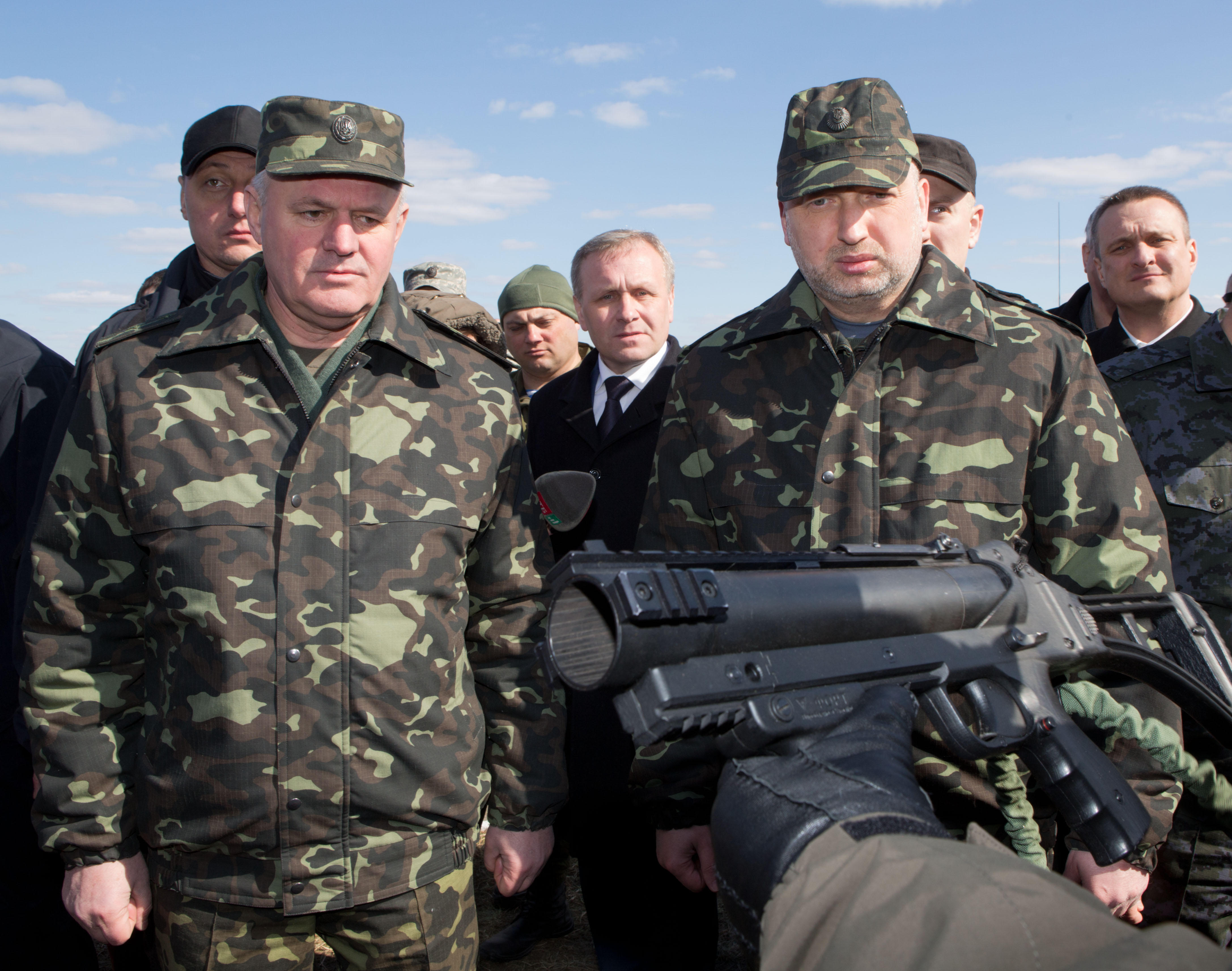 Вместе с и.о. Президента Украины на полигоне присутствовали и.о. министра обороны Украины Михаил Коваль, Начальник Генерального штаба - Главнокомандующий Вооруженных Сил Украины генерал - лейтенант Михаил Куцын, Командующий Сухопутных войск Вооруженных Сил Украины Анатолий Пушняков, и.о. Главы Администрации Президента Украины Сергей Пашинский.