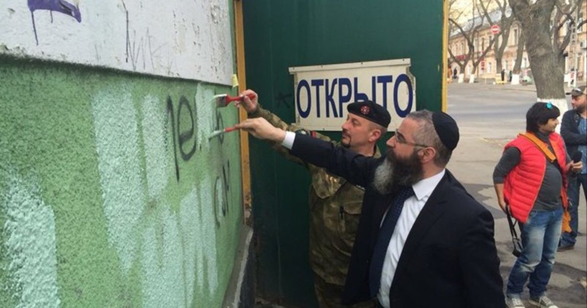 Главный раввин Одессы и Юга Украины Авраам Вольф и командир УНСО Валерий Загородний совместно закрашивали антисемитские надписи.
