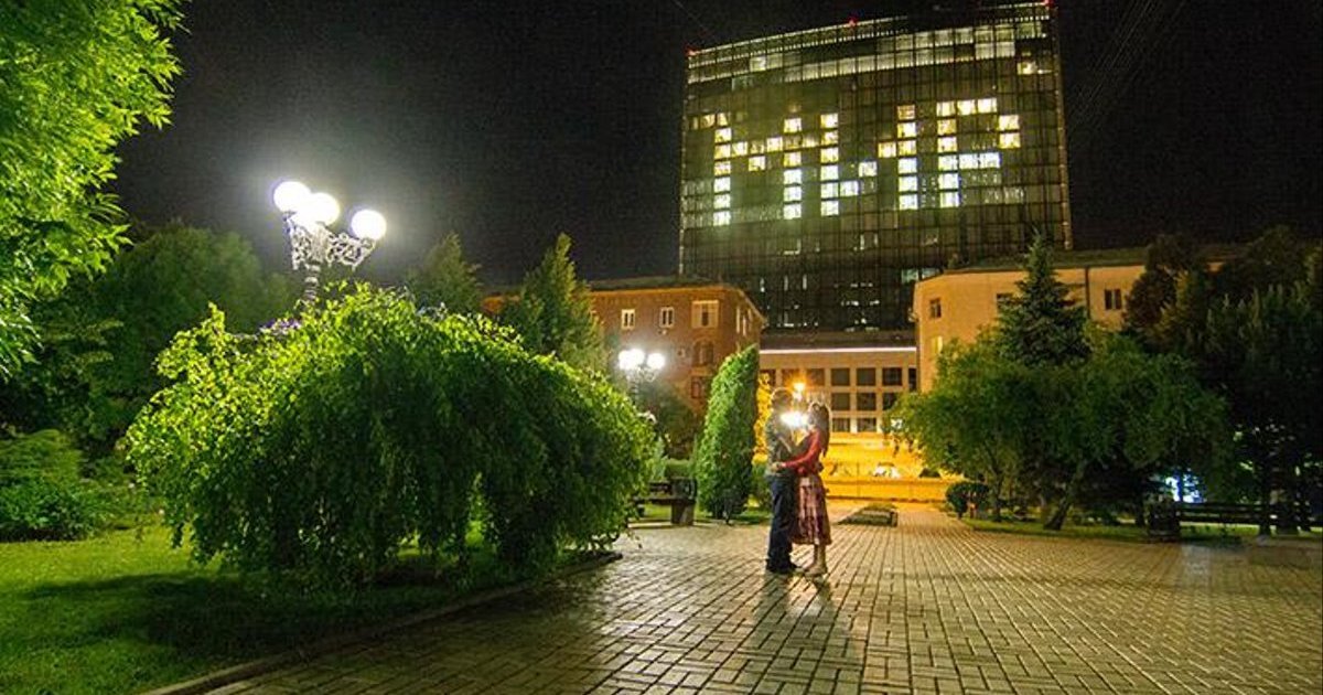 На крупном бизнес-центре в Донецке ночью засветилась надпись "МИР".
