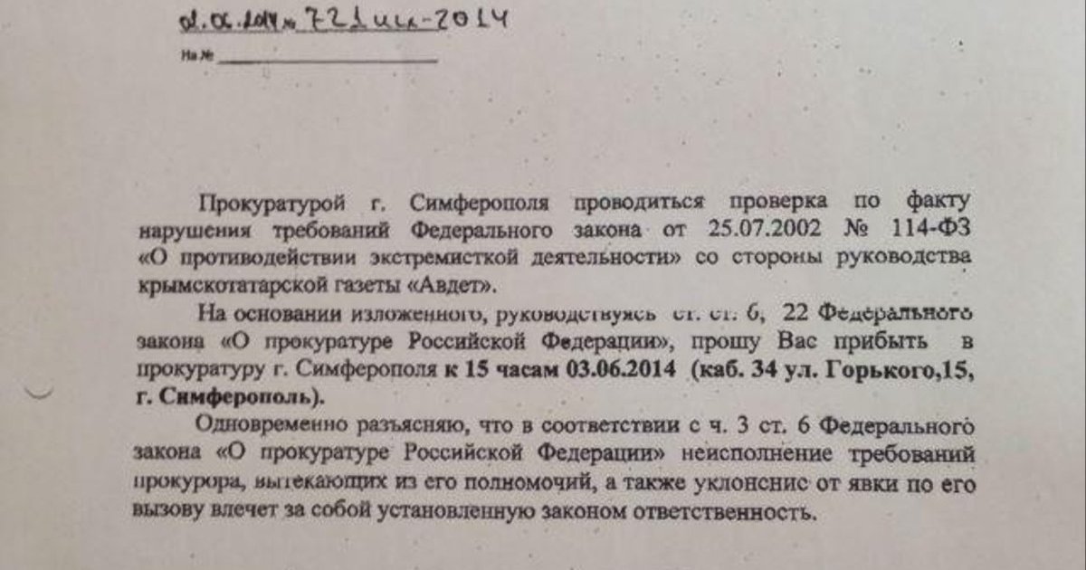 Как говорится в тексте повестки, которую получила редакция, «прокуратура» Симферополя проводит проверку по факту нарушения требований закона Российской Федерации «О противодействии экстремистской деятельности» со стороны руководства печатного издания. По словам Шевкета Кайбуллаева, никаких иных комментариев от представителей «прокуратуры» более не последовало. «Сегодня в 15 часов я приглашен на беседу в здание городской прокуратуры Симферополя. Предполагать содержание разговора сложно, но судя по статье, которая указана в повестке, нас будут обвинять в якобы экстремизме», - сказал главный редактор газеты.
