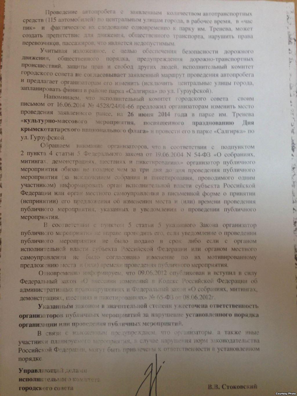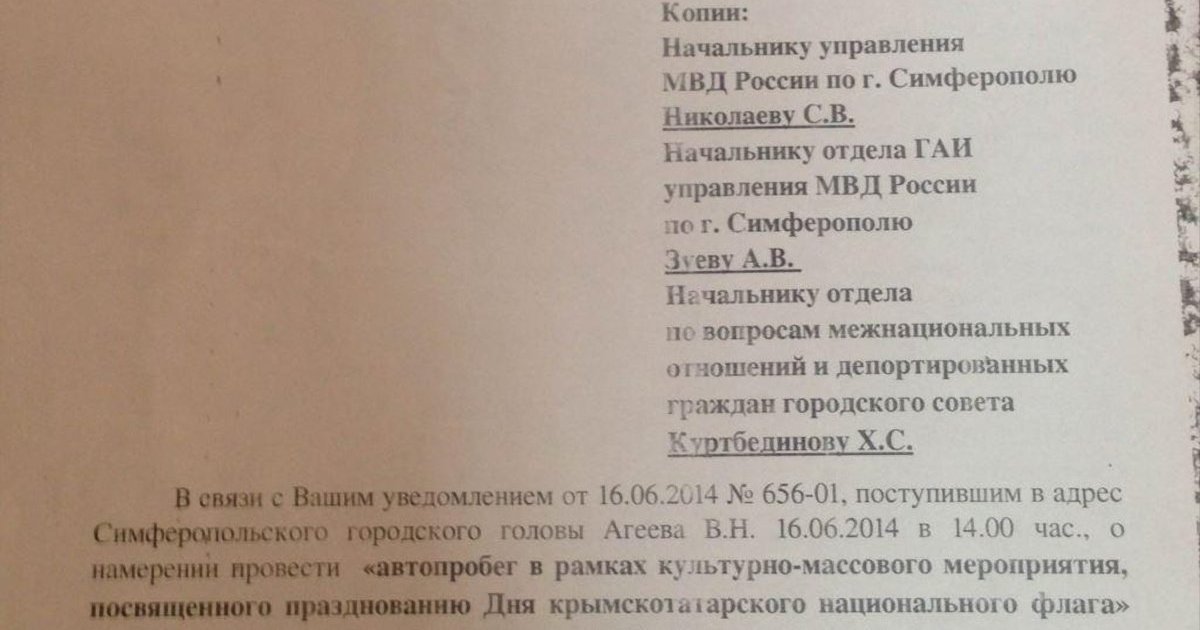Оккупационные власти Крыма запретили автопробег, посвященный Дню крымскотатарского флага. ДОКУМЕНТ