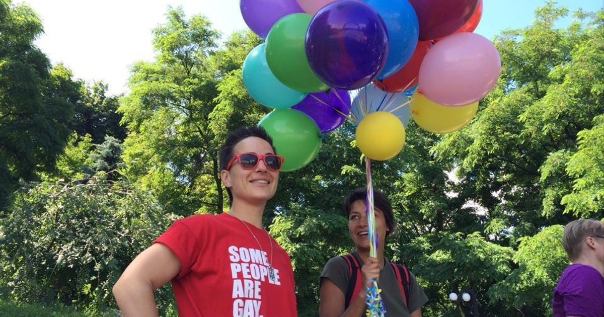 "Вчера милиция отказалась обеспечить нам право на мирные собрания. Но сегодня мы все-таки провели радужную акцию в формате флеш-моба! Мы прошли с плакатами и шариками до арки Дружбы Народов, где выпустили шарики со слоганами в небо. Спасибо всем, кто присоединились к акции", - написала она в Фейсбук.