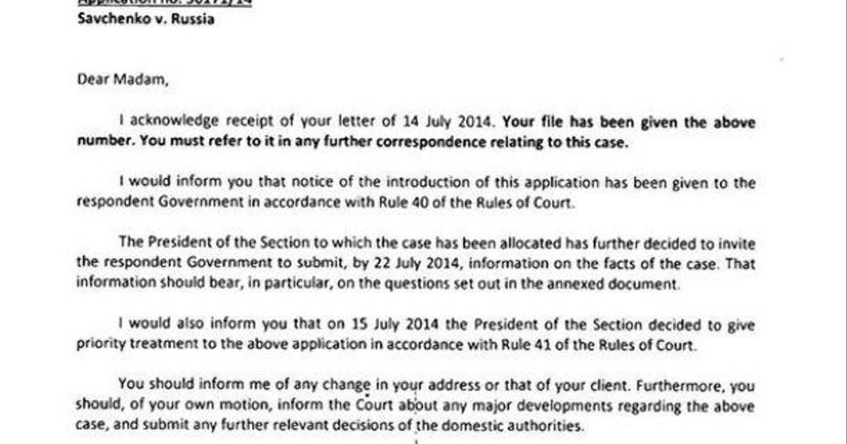 Европейский суд по правам человека начал производство в деле Надежды Савченко против России, предоставив ему статус приоритетного.