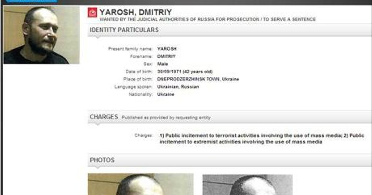 Согласно сообщению на сайте, подозреваемого Яроша разыскивают судебные органы России для предъявления обвинения и отбывания наказания.