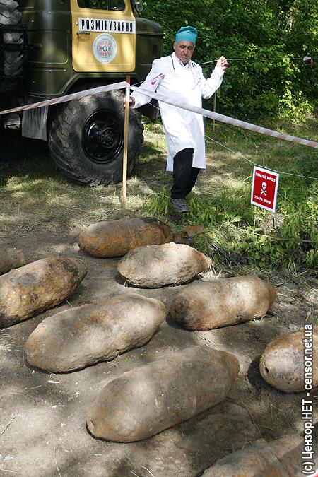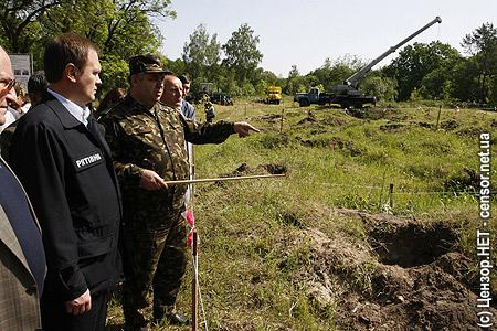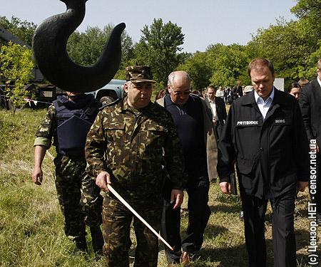 Глава МЧС В.Шандра посетил место разминирования в урочище "Толстое", осмотрел рабочие участки проведения сплошной очистки местности, а также временного складирования боеприпасов, их погрузки и уничтожения.