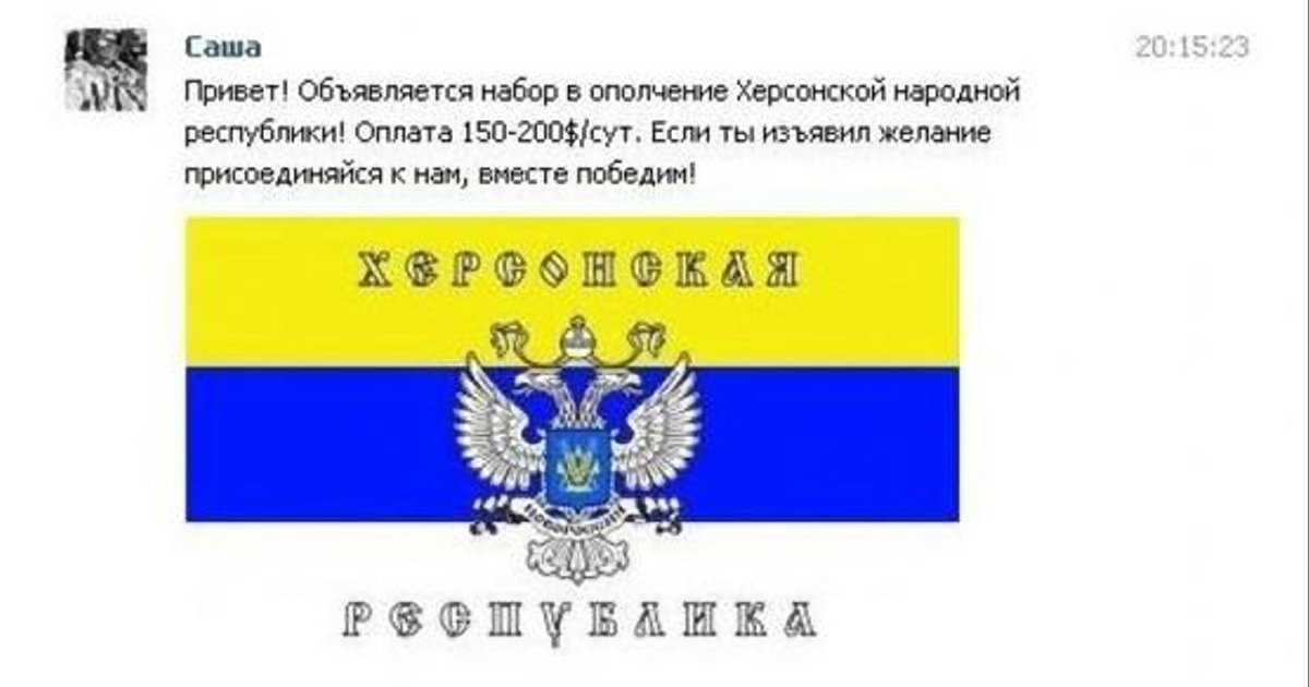 Жителей Херсона посредством сообщений в социальных сетях призывают вступать в ополчение некой Херсонской народной республики с целью подзаработать.