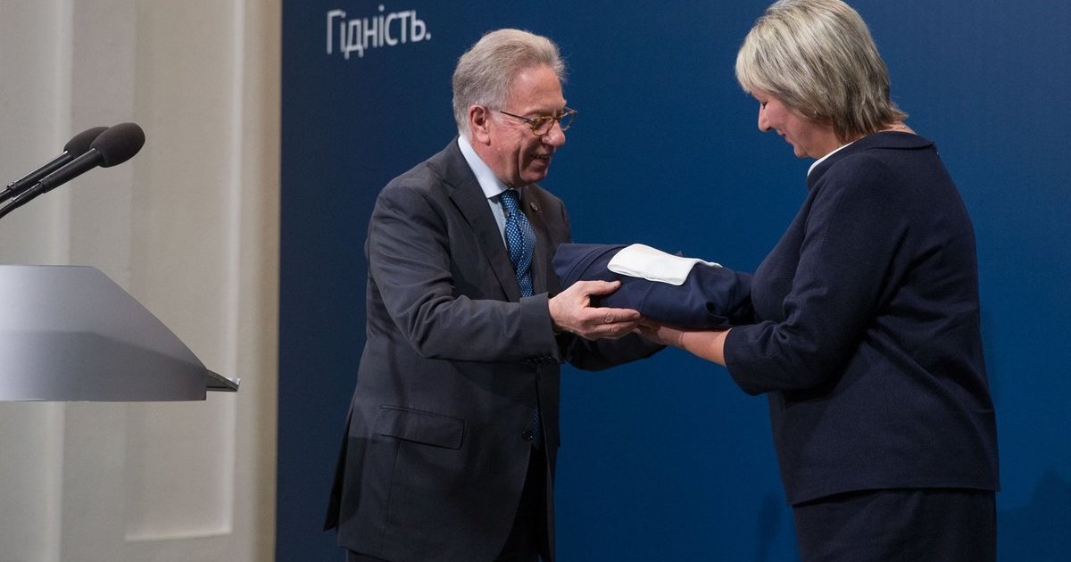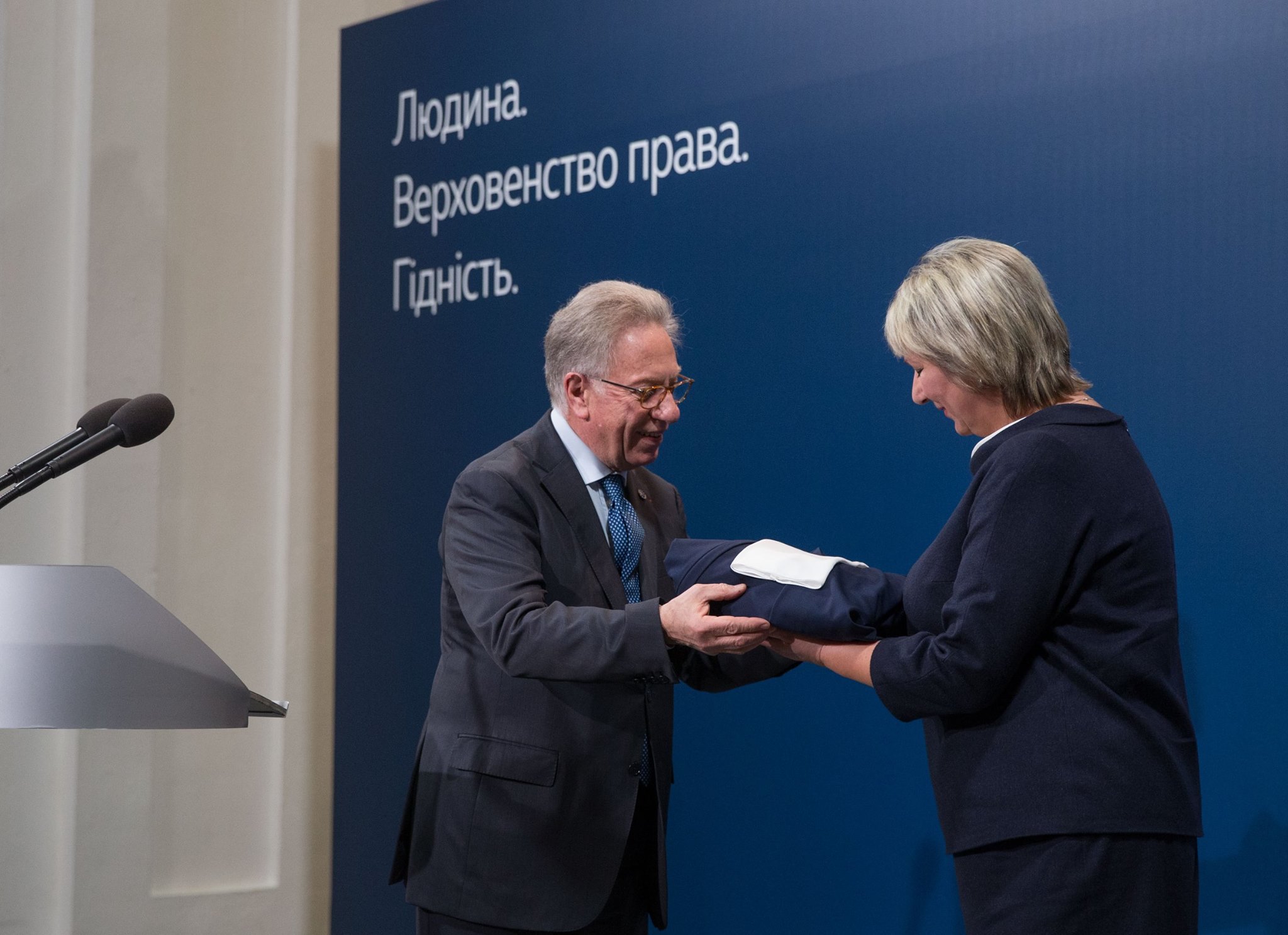 Председатель Венецианской комиссии Джанни Букиккио вручил главе Верховного Суда Украины Валентине Данишевской судейскую мантию нового образца.