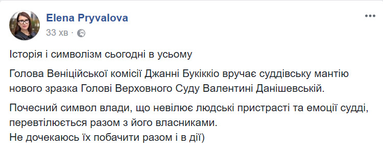 "История и символизм сегодня во всем. Председатель Венецианской комиссии Джанни Букиккио вручает судейскую мантию нового образца Председателю Верховного Суда Валентине Данишевской. Почетный символ власти, который невилирует человеческие страсти и эмоции судьи, перевоплощается вместе с его владельцами. Не дождусь их увидеть вместе и в действии", - написала она.