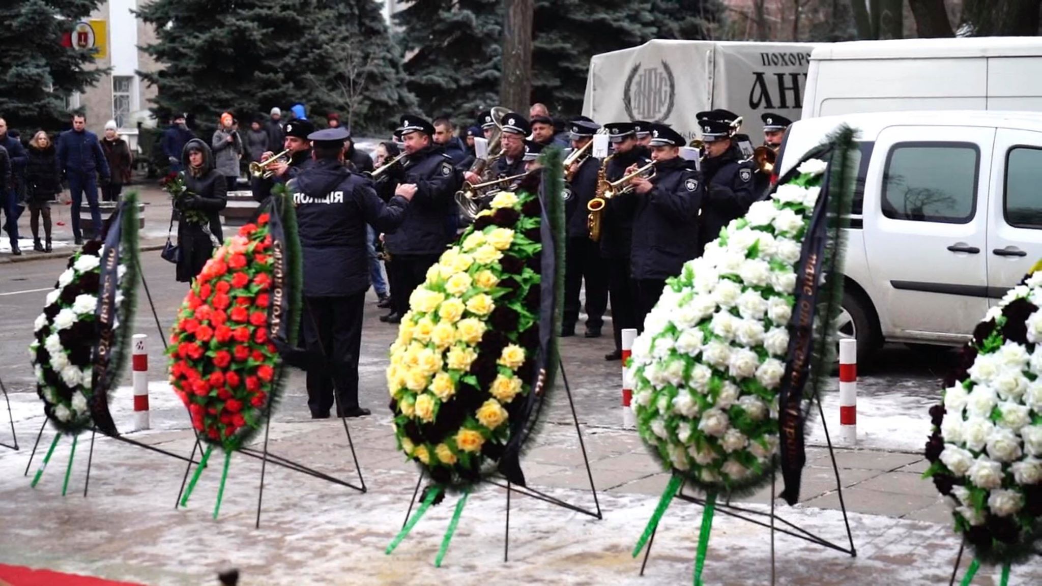 Сотни людей, среди которых коллеги-полицейские пришли сегодня к Дому офицеров, чтобы в последний путь провести молодого офицера. У него остались жена и двухлетняя дочь.