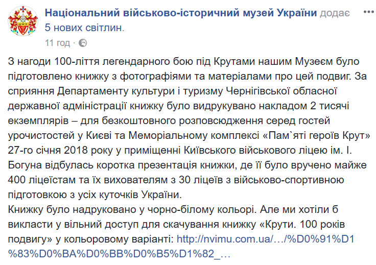 По случаю 100-летия легендарного боя под Крутами в Национальном военно-историческом музее Украины было подготовлено книжку с фотографиями и материалами об этом подвиге.