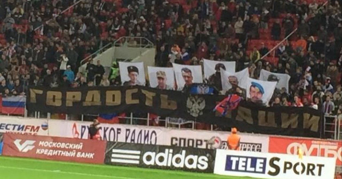 Во время отборочного матча на Чемпионат Европы-2016 Россия - Молдова болельщики российской сборной вывесили портреты боевиков, развернувших войну на востоке Украины.