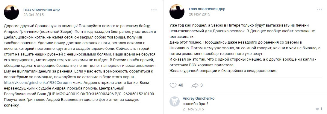 14 декабря 2015 г. Виктор Пешков, координатор организации "Феникс Донбасса", которая занимается сбором средств на лечение боевиков, выкладывает на своем канале YouTube видео, в котором Андрей Гринченко благодарит доноров за оказанную помощь.