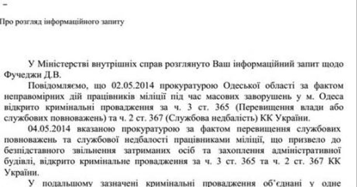 У Яремы рассказали, что Фучеджи обвиняют в том, "что он не организовал и не скоординировал должным образом 02.05.2014, во время массовых беспорядков на ул. Греческой и на площади Куликово поле, имеющиеся в его подчинении силы и средства, которые осуществляли охрану общественного порядка и находились в резерве, что привело к наступлению тяжких последствий, а также превысил свои служебные полномочия, в результате чего из изолятора временного содержания Одесского горуправления незаконно освобождены 63 человека, подозреваемые в массовых беспорядках".