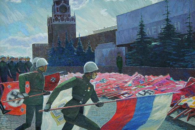 Триколор (тогда еще РОА, а не РФ) бросают к подножию мавзолея. © Картина советского художника