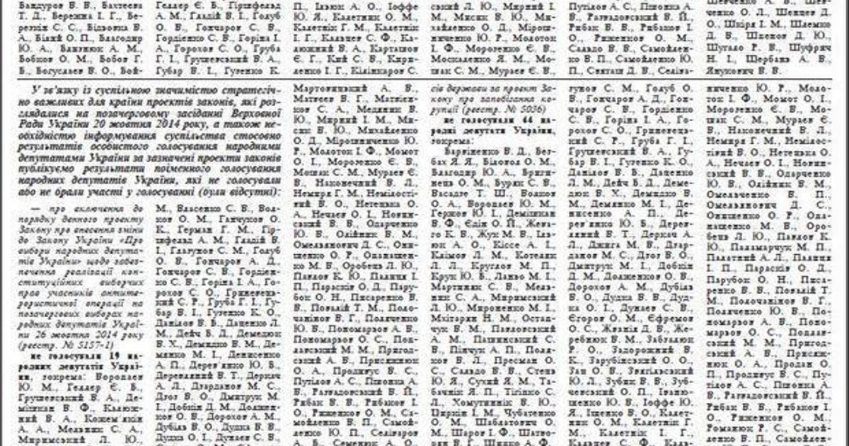 Парламентская газета "Голос Украины" обнародовала список депутатов, отсутствовавших и не голосовавших на внеочередном заседании парламента 20 октября, на котором был провален законопроект о голосовании участников АТО.