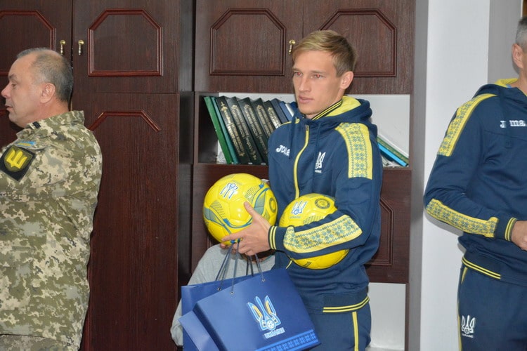 Уже традиционно тренер и игроки презентовали защитникам родины мячи с автографами и сувениры, а также билеты на матч молодежки против сборной Шотландии, который состоится 12 октября на "Оболонь-Арене" в Киеве.