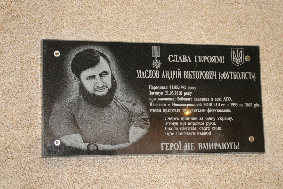 Андрей Маслов (позывной Футболист) родился и жил в пгт Новопокровка. Проходил службу в звании младшего сержанта, командира противодиверсионной группы в составе 24- й отдельной механизированной бригады. Погиб 21 мая 2018 г. в возрасте 31 год в боевом столкновении с вражеской диверсионно-разведывательной группой на окраине поселка Пивденное, недалеко Горловки. Похоронен на Аллее Славы в Харькове. У него остались родители, жена и сын.