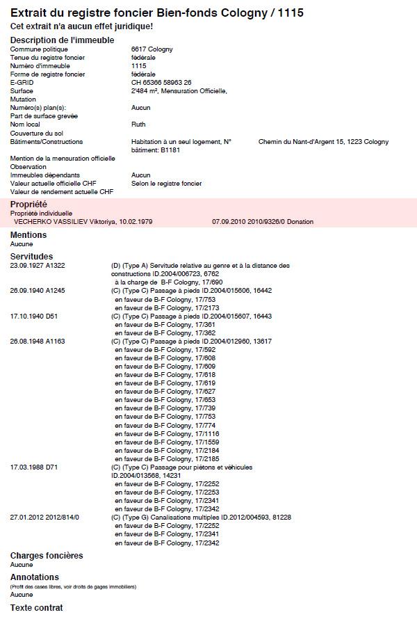 Лещенко отмечает: "В нашем распоряжении есть выписка из швейцарского реестра о принадлежности Виктории Вечерко дома на берегу Женевского озера, по адресу Chemin du Nant-d'Argent 15, 1223 Cologny.