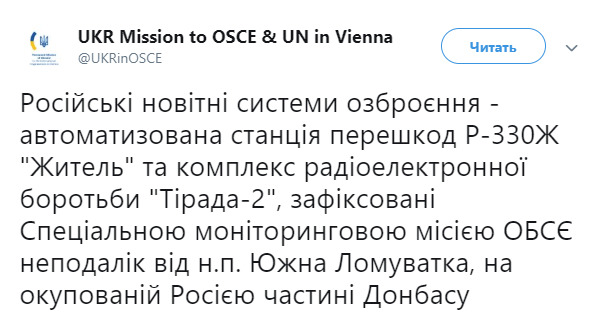 "Российские новейшие системы вооружения – автоматизированная станция помех Р-330Ж "Житель" и комплекс радиоэлектронной борьбы "Тирада-2", зафиксированные Специальной мониторинговой миссией ОБСЕ неподалеку от н.п. Южная Ломоватка, на оккупированной Россией части Донбасса", - говорится в сообщении.