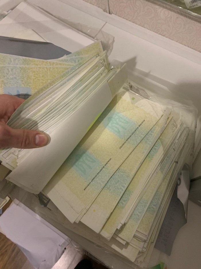 Во время санкционированных обысков в Киеве и области в помещениях фигурантов дела правоохранители обнаружили сотни поддельных печатей и штампов, тысячи бланков различных государственных учреждений и министерств, десятки изготовленных поддельных документов, среди которых паспорта гражданина Украины, паспорта РФ, вида на жительство, голографические элементы защиты , доверенности, акты на землю и т.д., а также оружие и боеприпасы к нему.