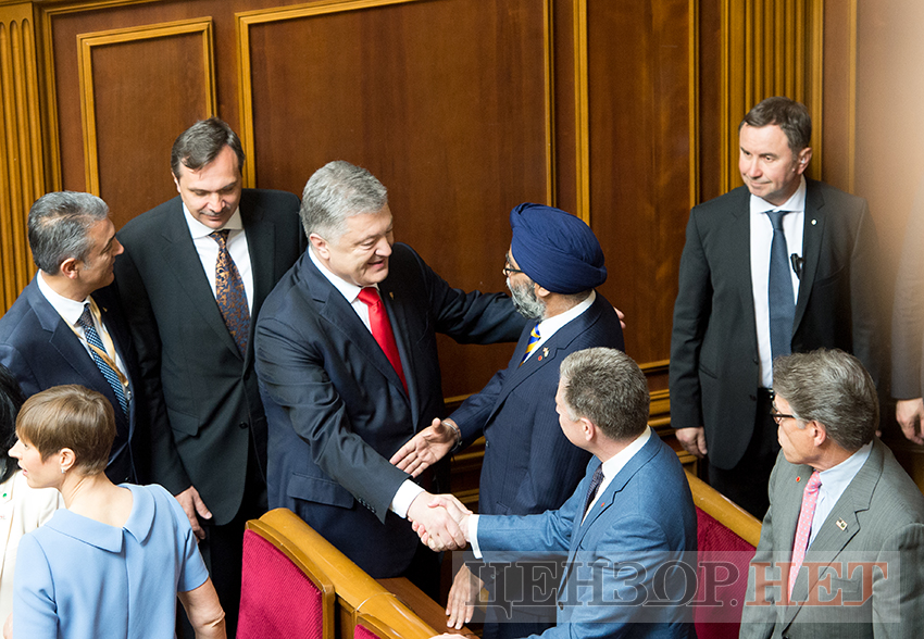 Пятый президент Петр Порошенко приветствует иностранных гостей: спецпредставителя США по Украине Курта Волкера и главу Минобороны Канады Харджита Саджана.